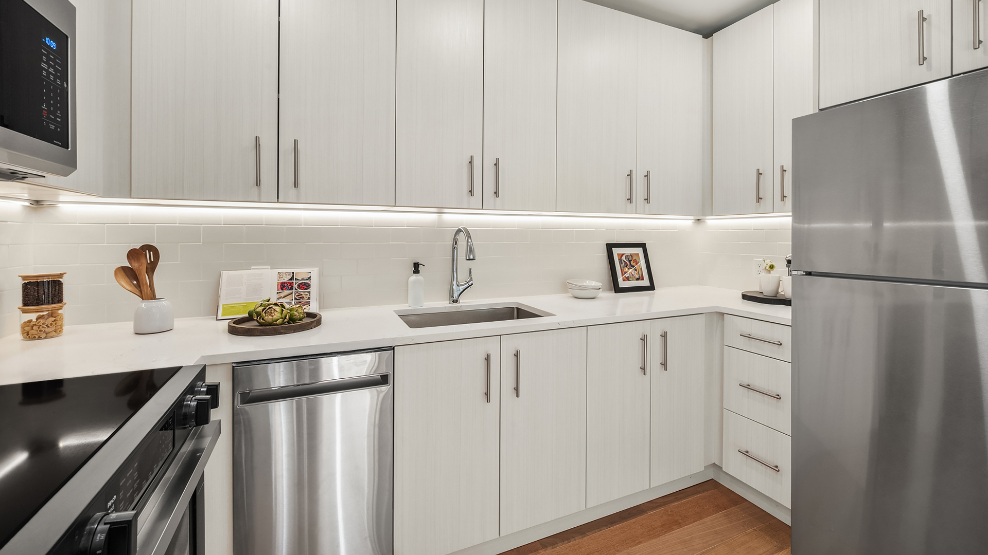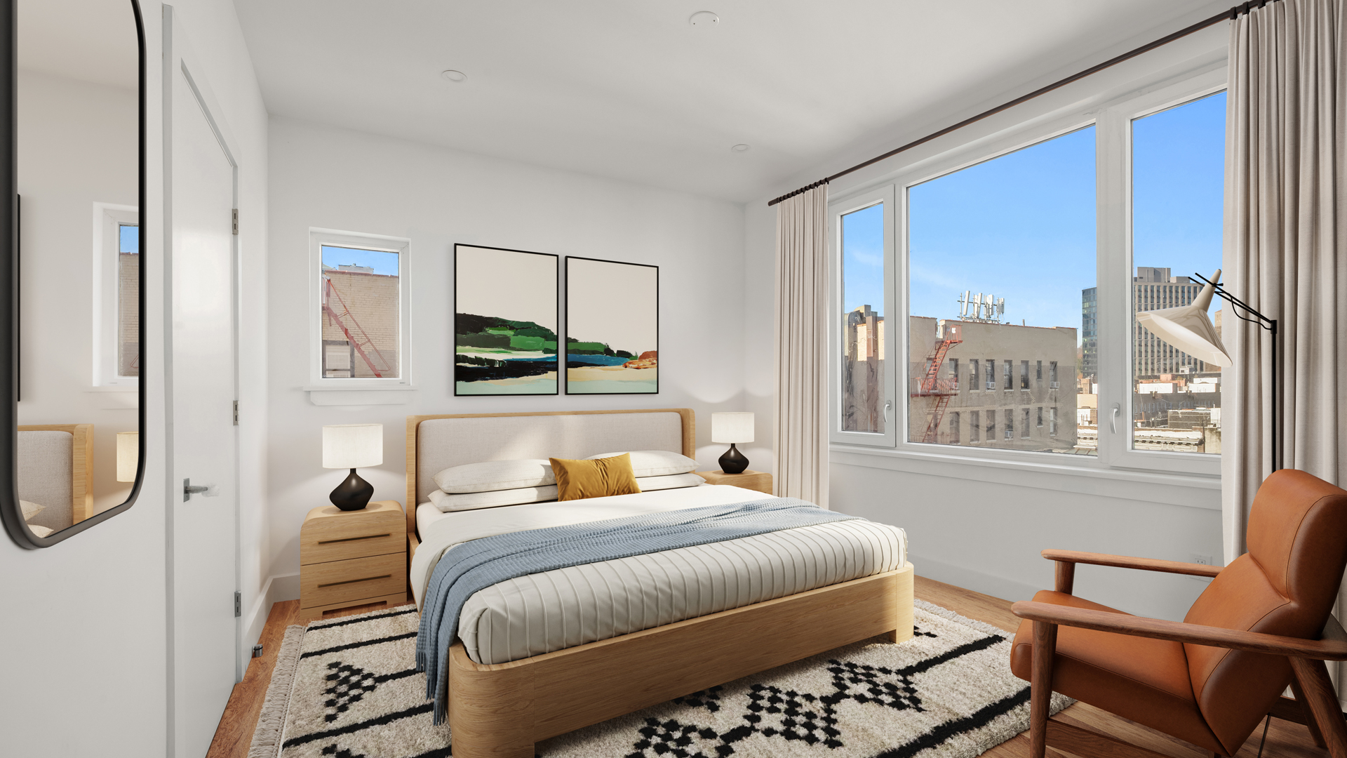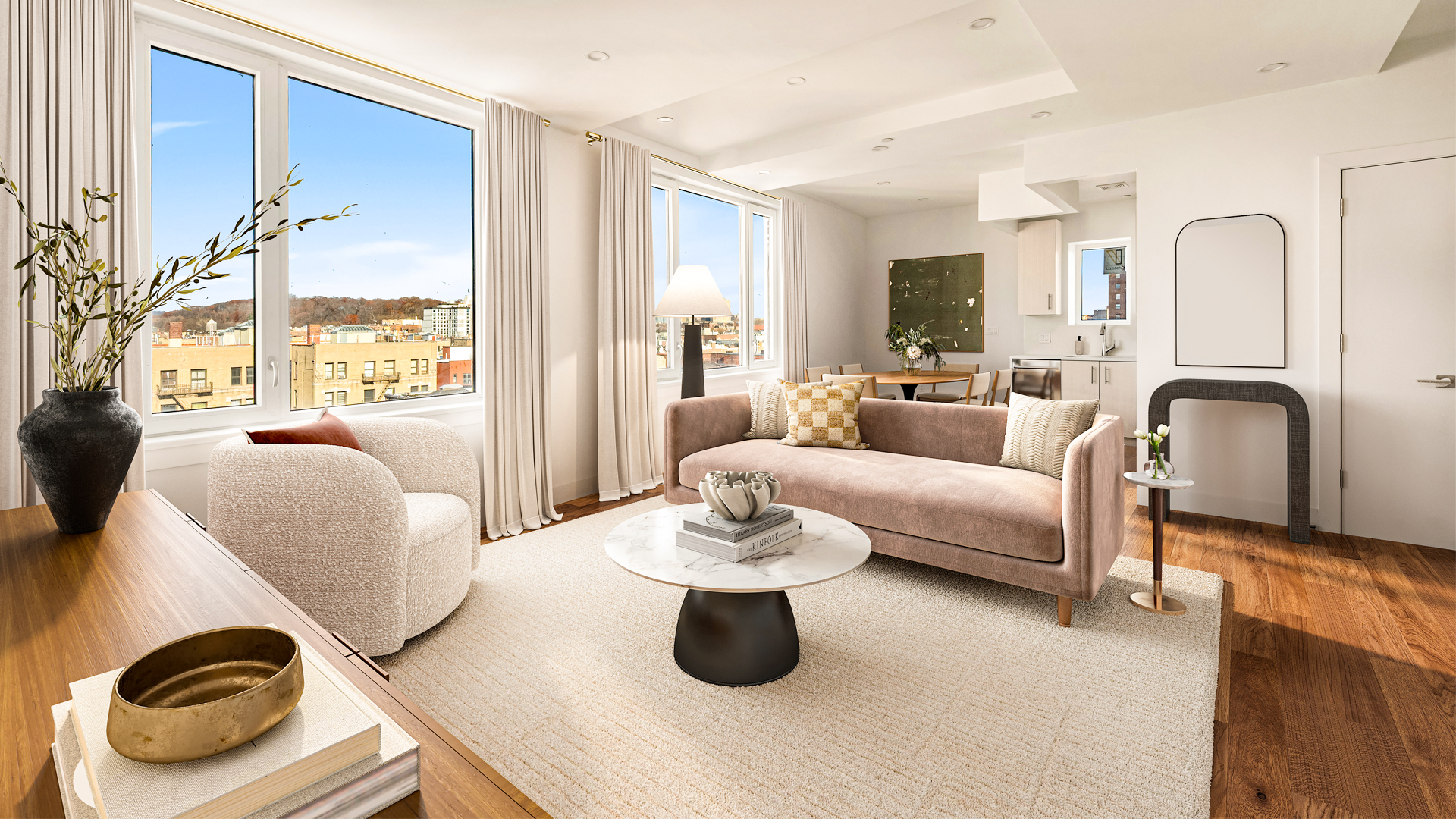 Light wood flooring throughout anchors each residence’s open kitchen-living area, continuing into the bedrooms for seamless transitions between entertainment, leisure and rest.